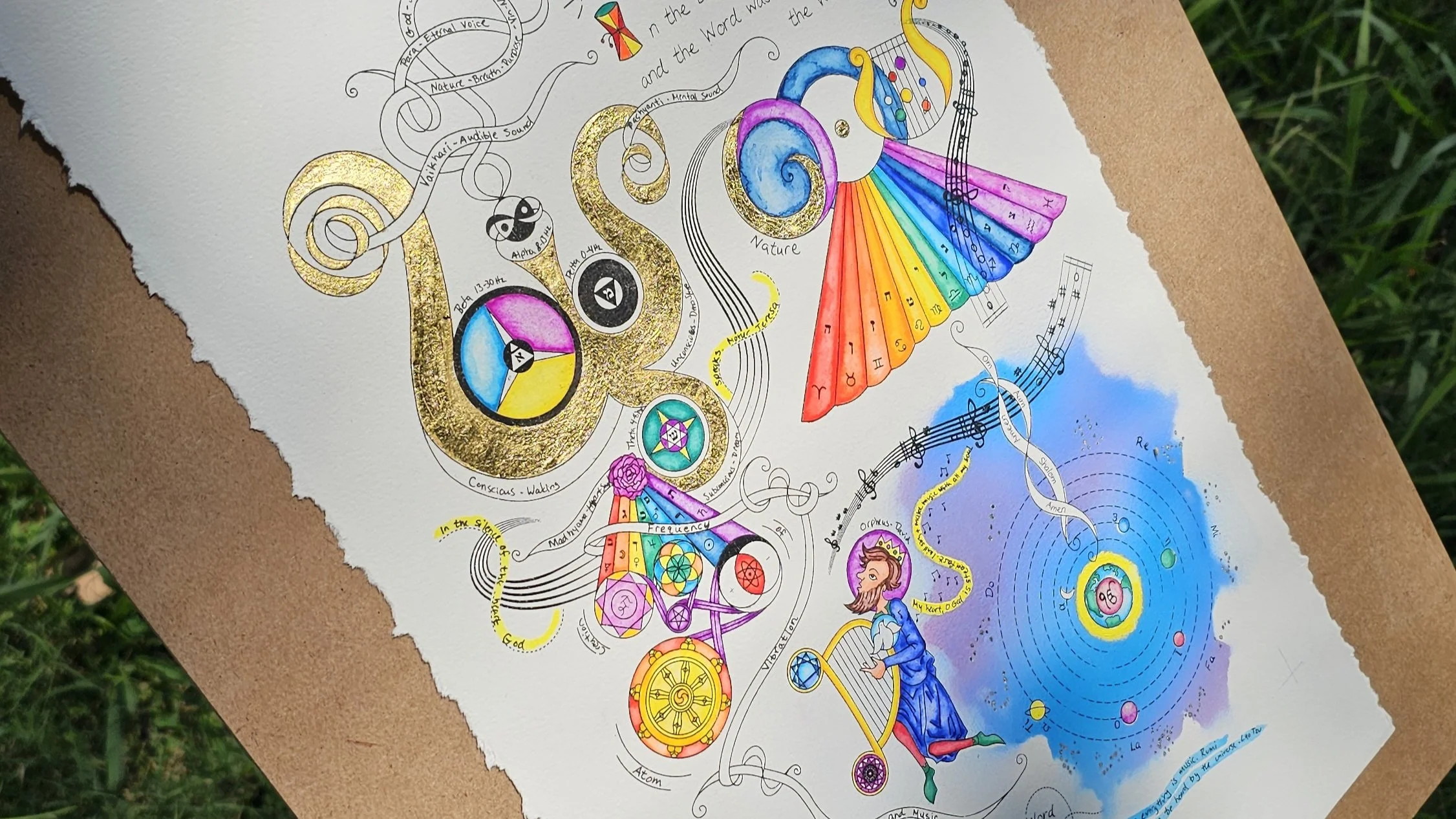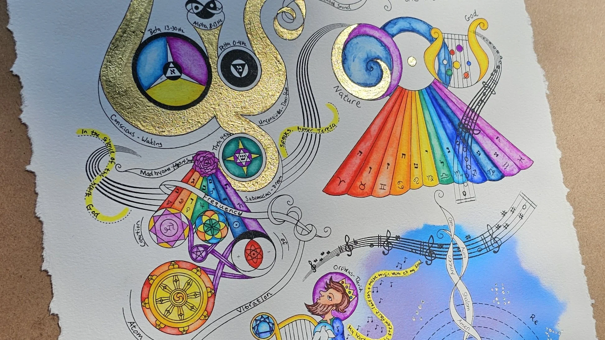 The Word Om is the first in my illuminated manuscript series. The content explores the ideas around the cosmic sound of creation, the Om, through worldwide myth, religion, and science. The Om symbol is gilded in gold leaf, and the quote being illuminated is from the Bible in the book of John 1:1 “In the beginning was the Word and the Word was with God and the Word was God.”